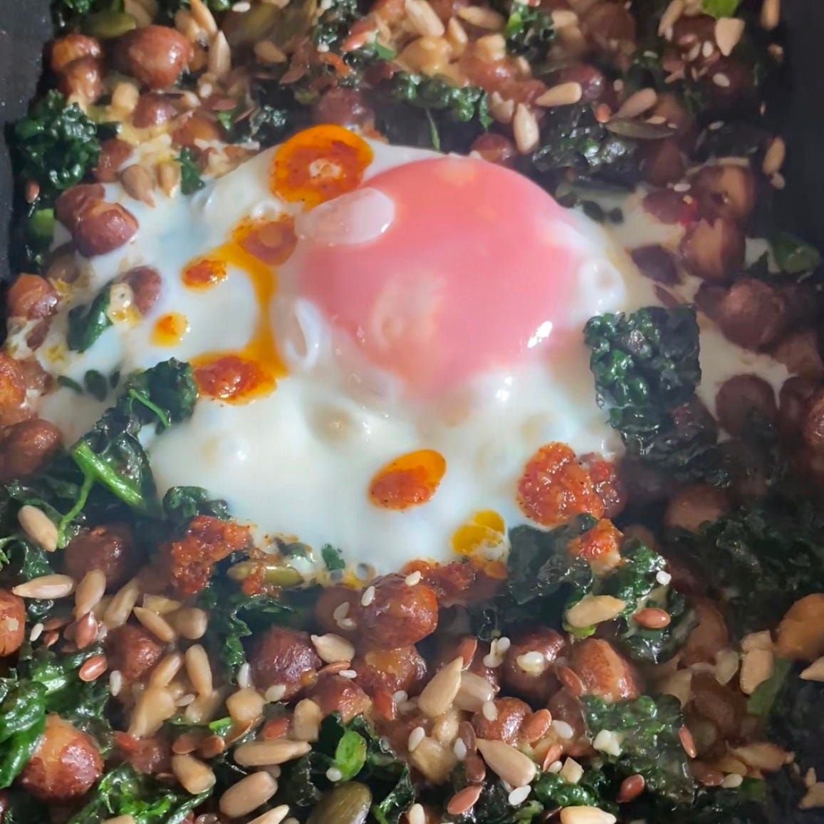 Heat 1 tbsp rayu in a frying pan for a few seconds, add the kale, herbs and a splash of water, and cook for a couple of minutes. Stir the mixture so all the leaves get covered with rayu. Add the seed mix and a little salt.
